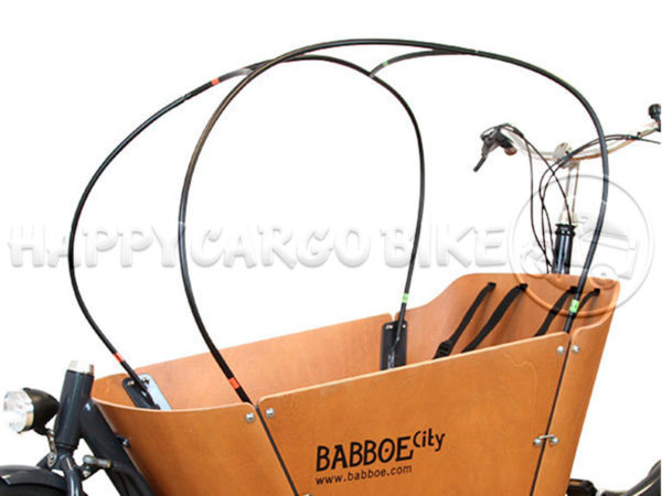 El conjunto de postes para las bicicletas de carga Babboe se coloca fácil y rápidamente en su lugar al insertarlos en los puntos de fijación de su bicicleta de carga. Siga los pasos de instalación en el manual provisto.