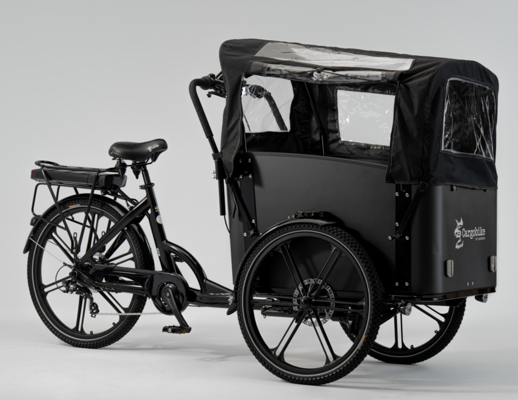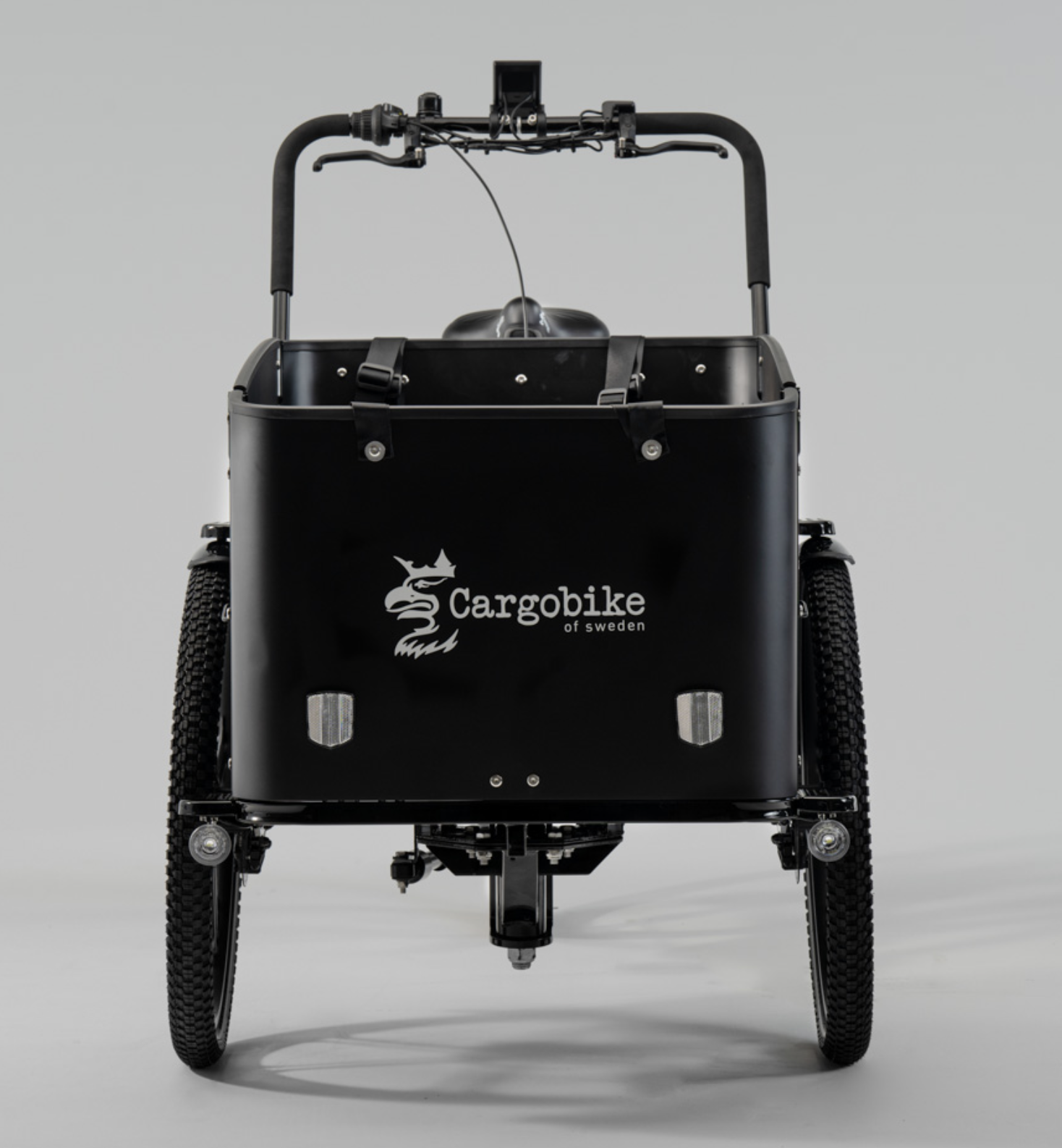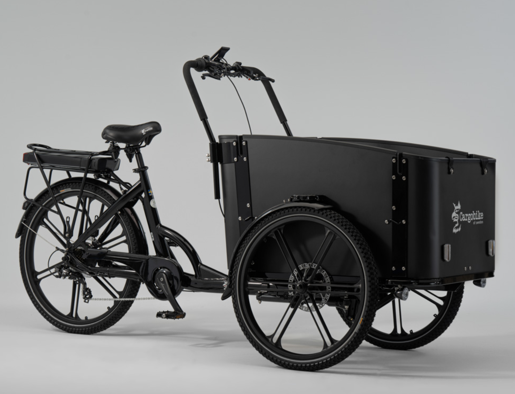 Reconocerás el diseño del cuadro, la caja frontal y las ruedas de nuestro modelo Cargobike DeLight. Pero a diferencia de nuestro DeLight, aquí encontrarás un motor de 45 Nm montado en la rueda trasera y la batería está ubicada en el portaequipajes trasero.
