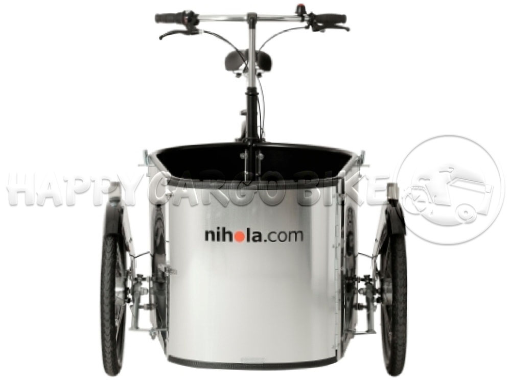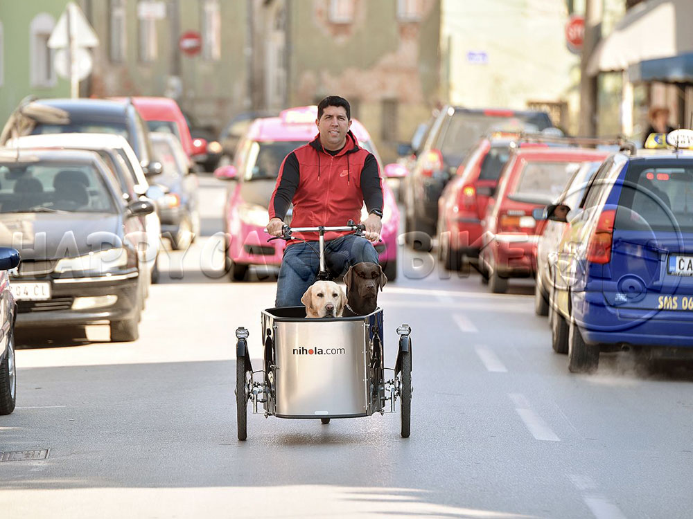 La bicicleta de carga Nihola Dog fue desarrollada para transportar perros. La puerta frontal de aluminio se puede abrir, por lo que un perro puede entrar y salir fácilmente de la cabina.
