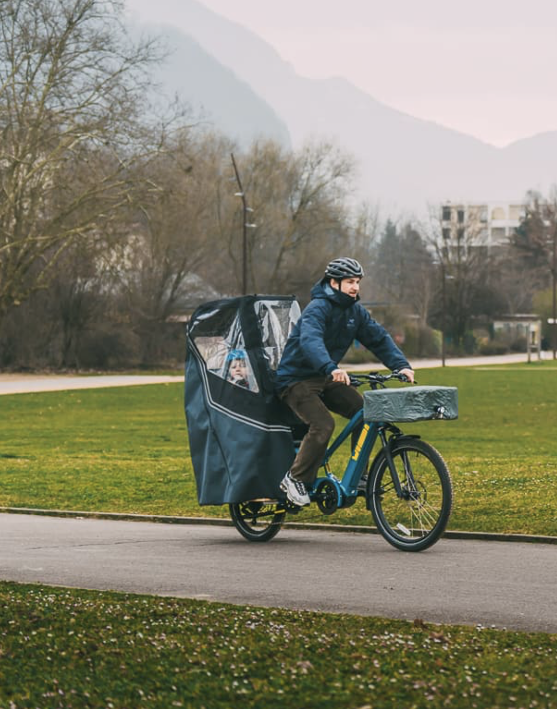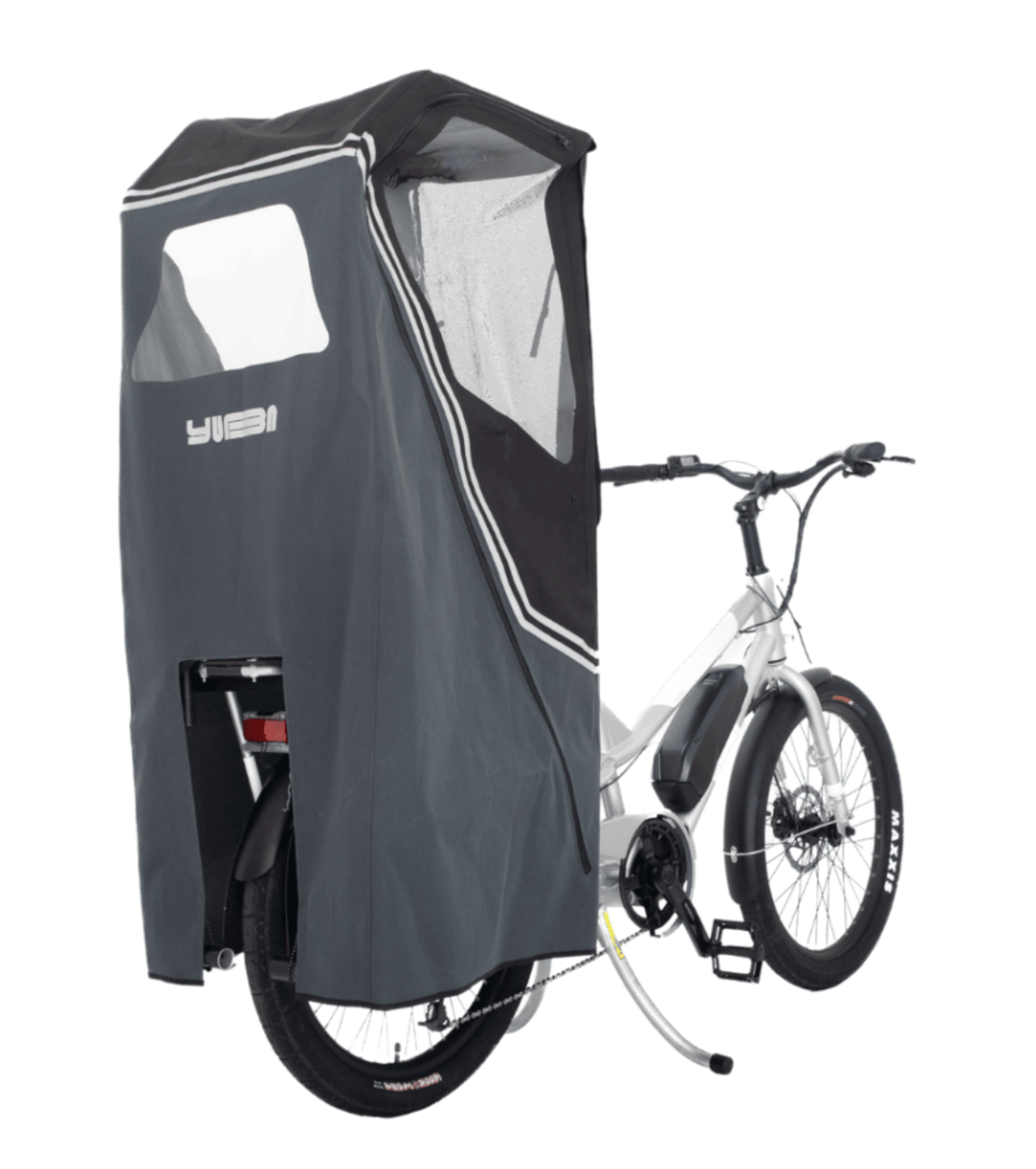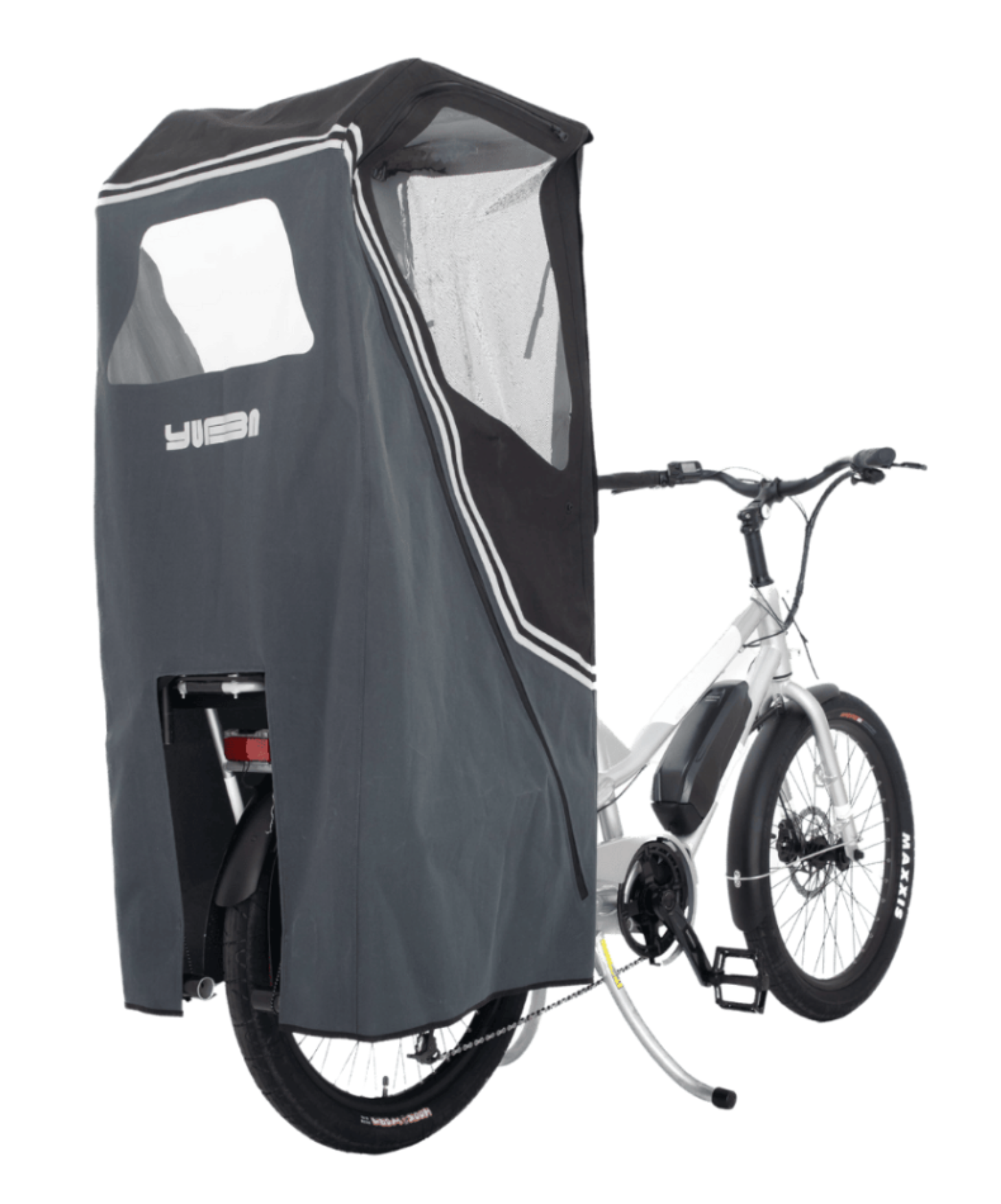 El toldo de lluvia Pop Shelter ofrece protección completa contra la intemperie para bicicletas de cola larga. Una evolución del Eco Pop Top, es más largo y ahora protege de la cabeza a los pies. Fabricado con materiales de calidad, protege a los pasajeros de la lluvia, el viento, la nieve y el sol. A diferencia del Eco Pop Top, se fija directamente a los portabicicletas Yuba, sin necesidad de Monkey Bars. También incorpora flujo de aire ajustable para una comodidad óptima, así como tiras reflectantes para una mayor visibilidad lateral y una mejor seguridad.