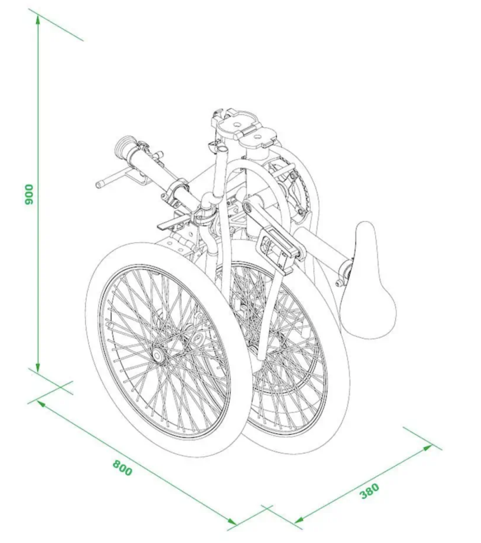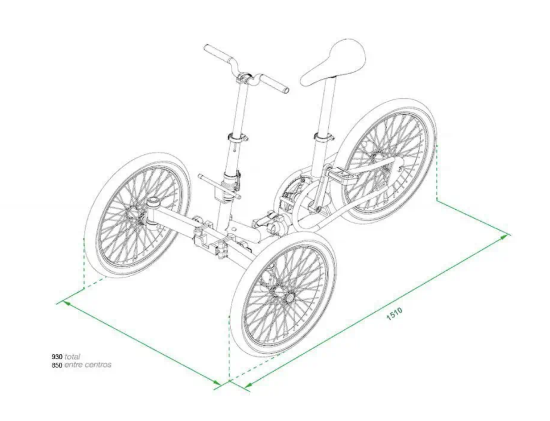 Las medidas del triciclo plegado son de 90x80x38cm, ocupando un 75% menos que en su forma desplegada.